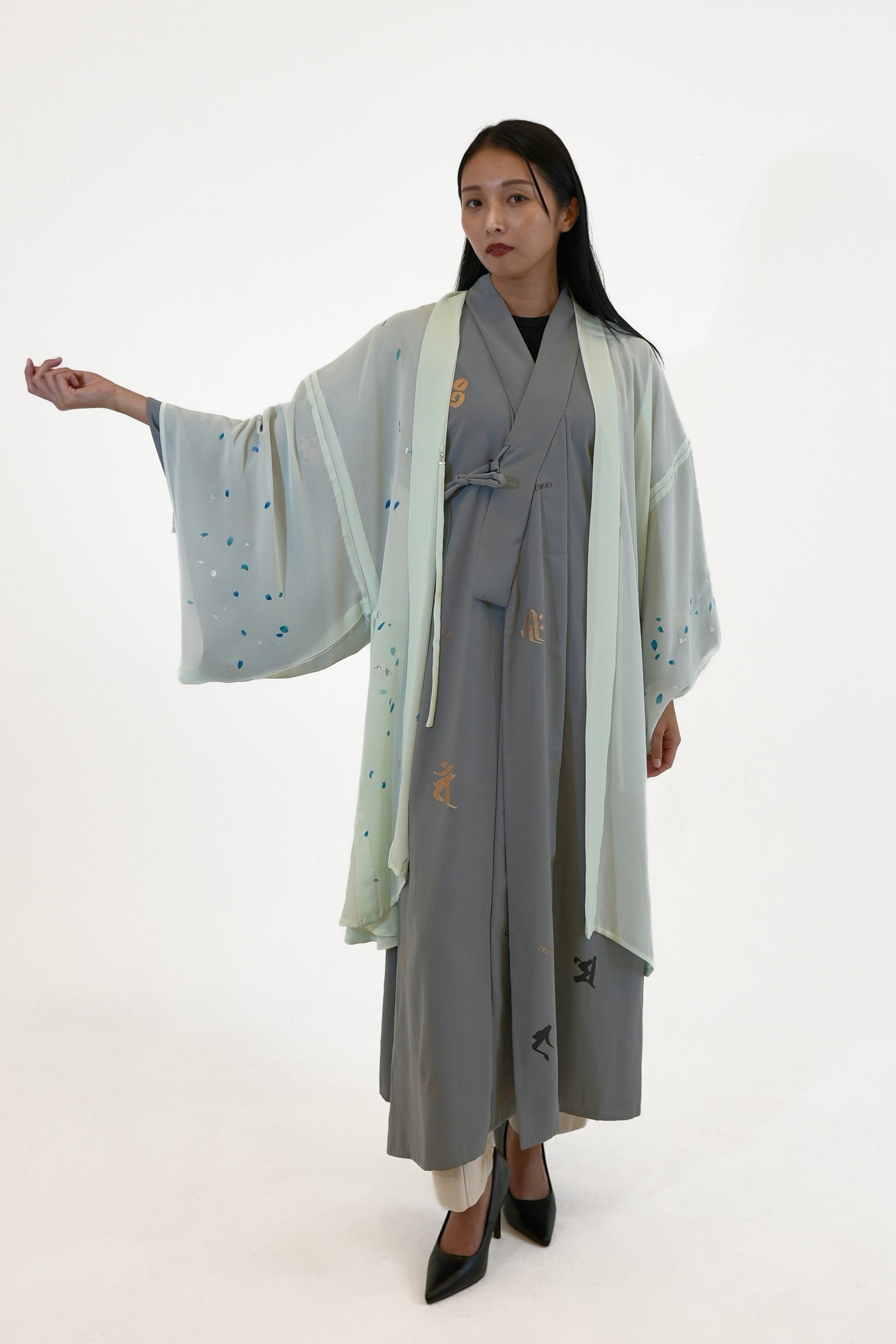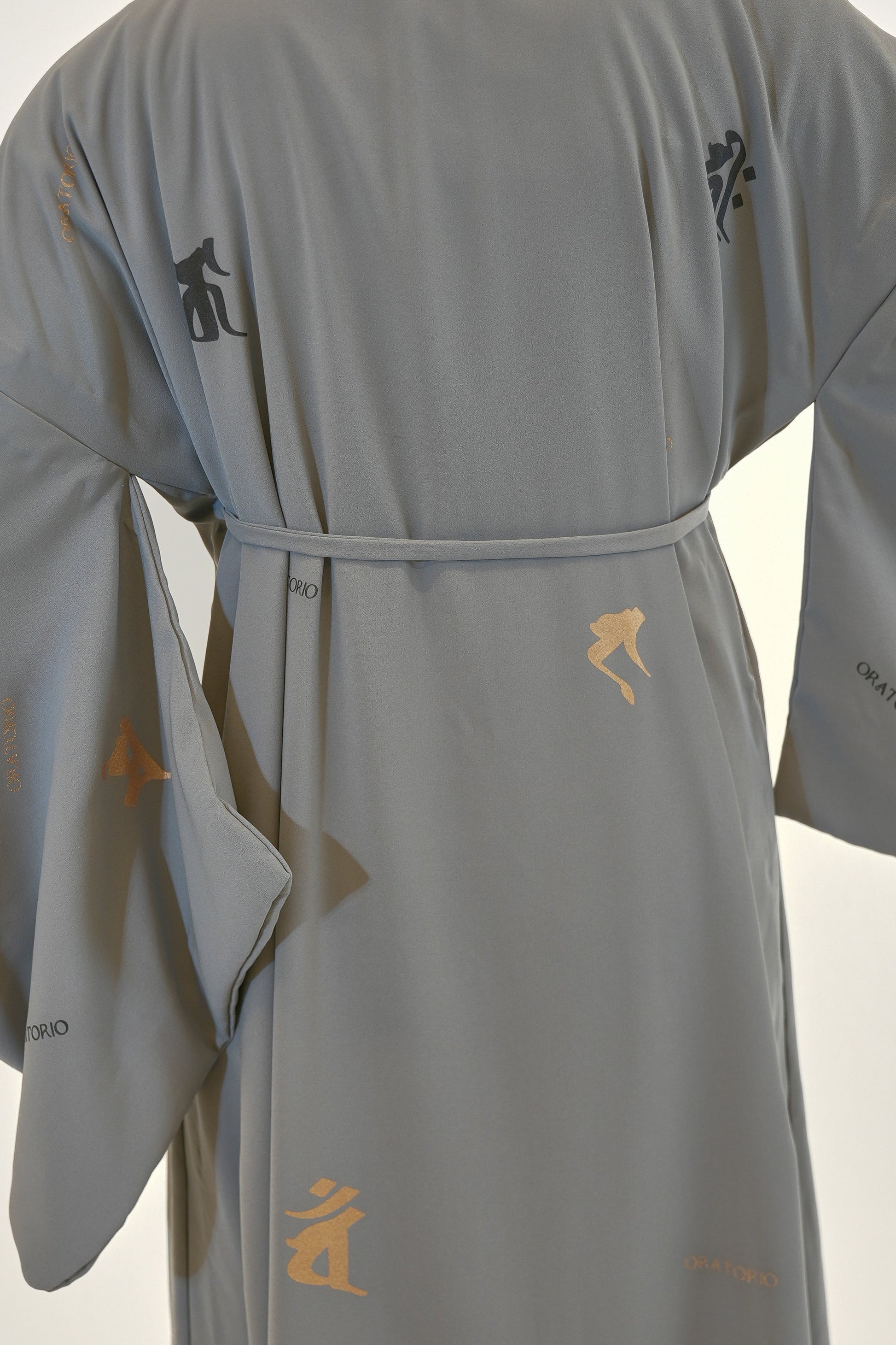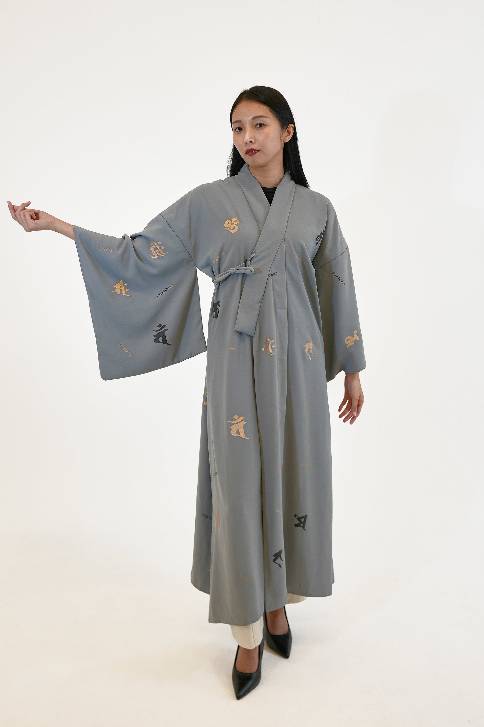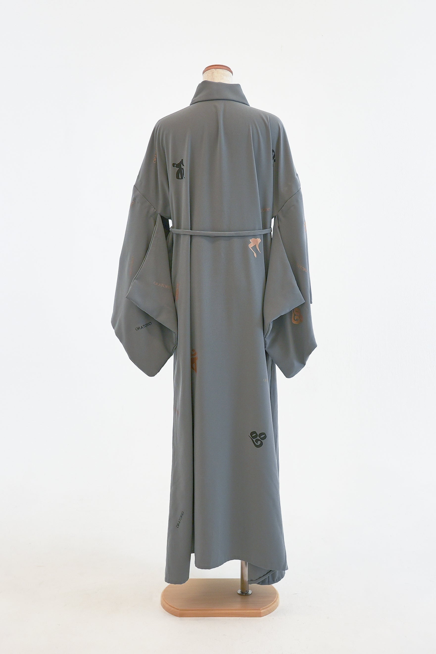グレーに梵字を散りばめたワンタッチ着物。